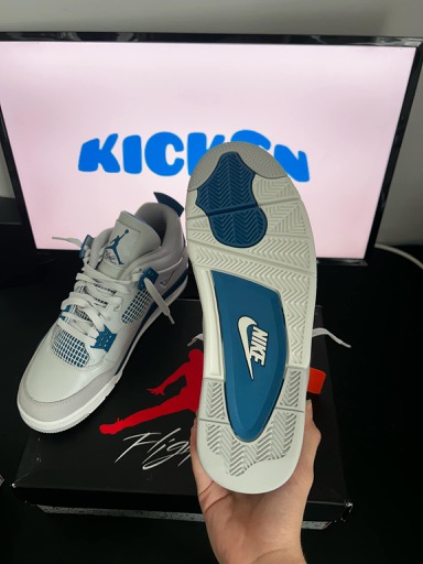 A Military Blue változat a fehér, kék és szürke színek kombinációjára épít, amely egy friss és élénk megjelenést kölcsönöz a cipőnek. A színvilág az Air Jordan 4 egyik legismertebb és legkeresettebb variációját eredményezte, különösen azok számára, akik a klasszikus, de mégis különleges dizájnt kedvelik.